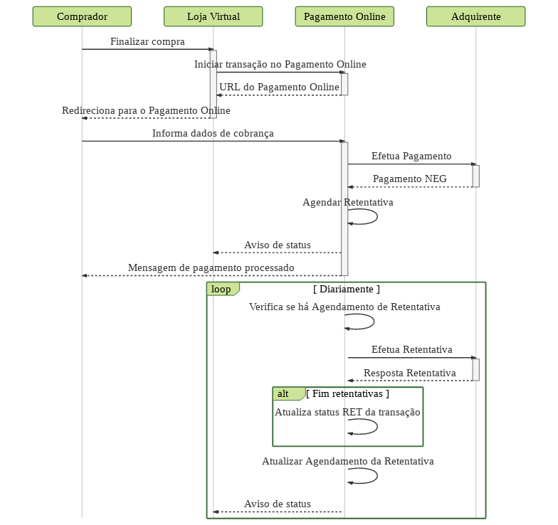 No fluxo de retentativa offline, a retentativa é agendada para ser executada em um outro momento e a transação fica marcada com status RET enquanto o processo não termina.