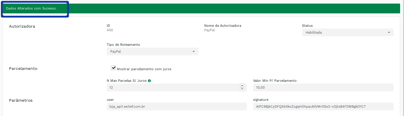 The option Configure Authorizers allows the alteration of the parameters referring to the authorized companies registered for a specific store. Through it, it is possible to modify the status of the authorizer, type of routing, and properties related to installment payments.